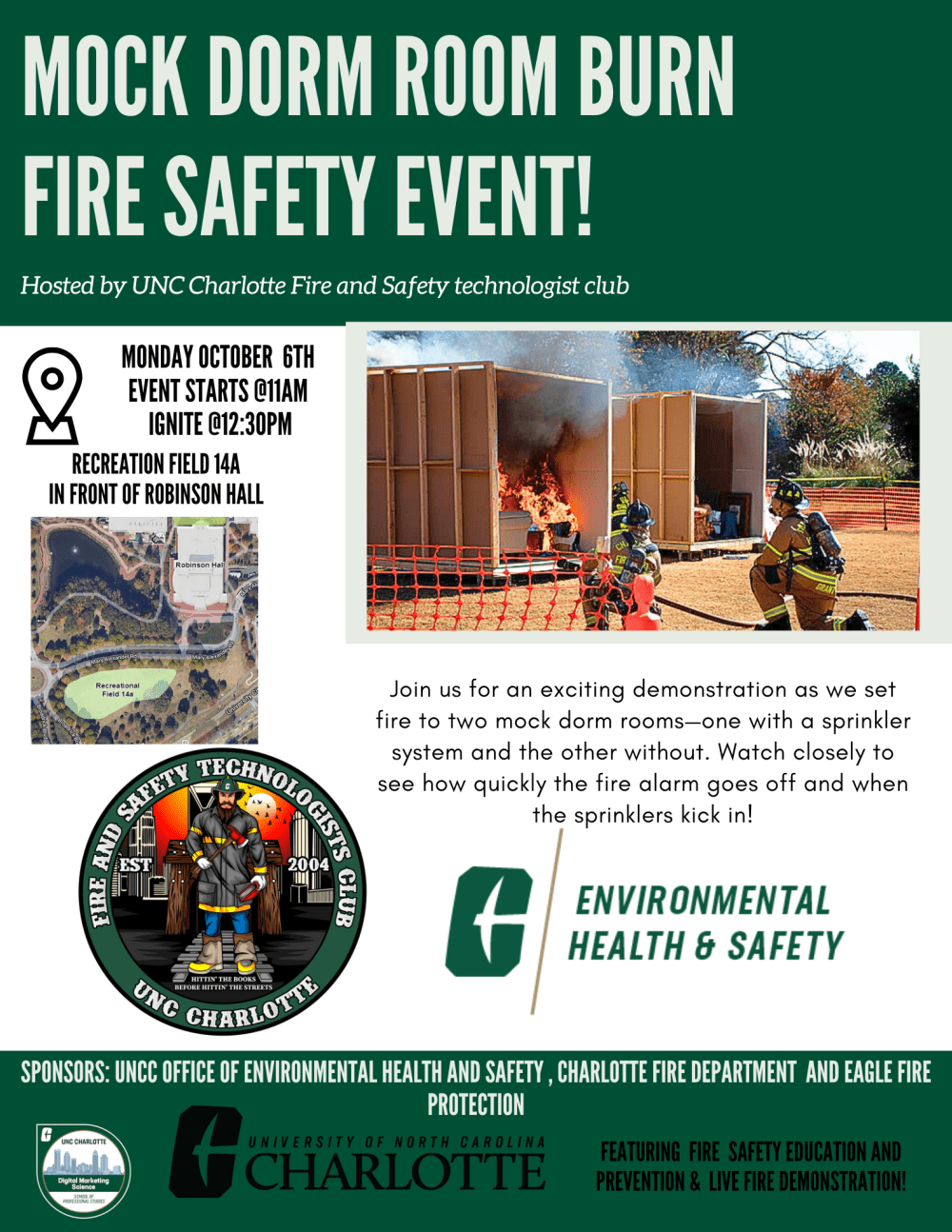 Fire Prevention Week runs from October 5th – 11th. Every year Environmental Health and Safety, along with the F.A.S.T. organization, takes this opportunity to reinforce the importance of fire safety and prevention by having a mock dorm room burn! This event will be on Monday, October 6th in the front fields of campus on field 14A starting at 11:00 AM. The fire will ignite at 12:30PM. We will have vendors with great safety information as well as free snow cones! Come by and enjoy this awesome fire safety event! For more information or questions, contact us at 704-687-1111 or ehsoffice@charlotte.edu